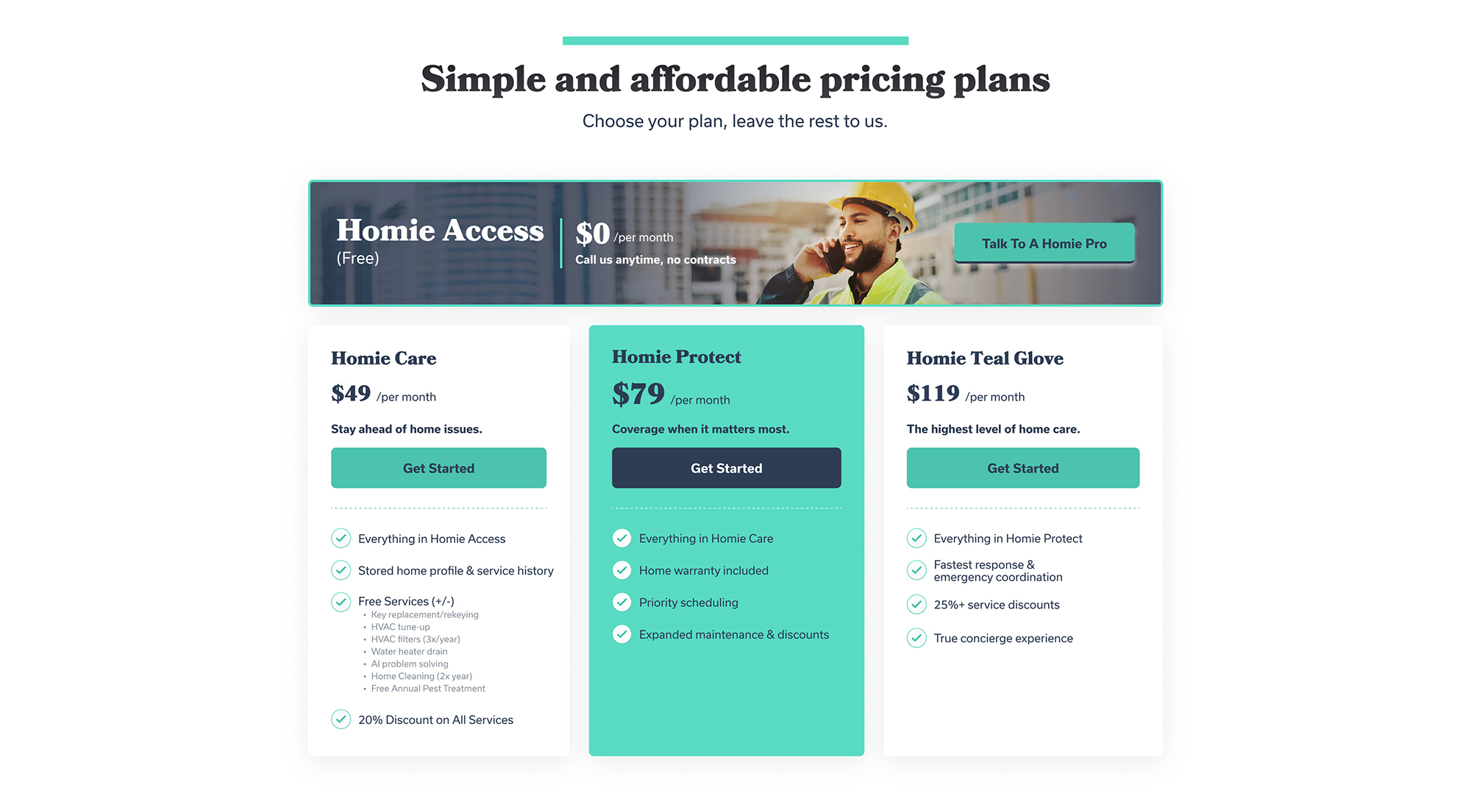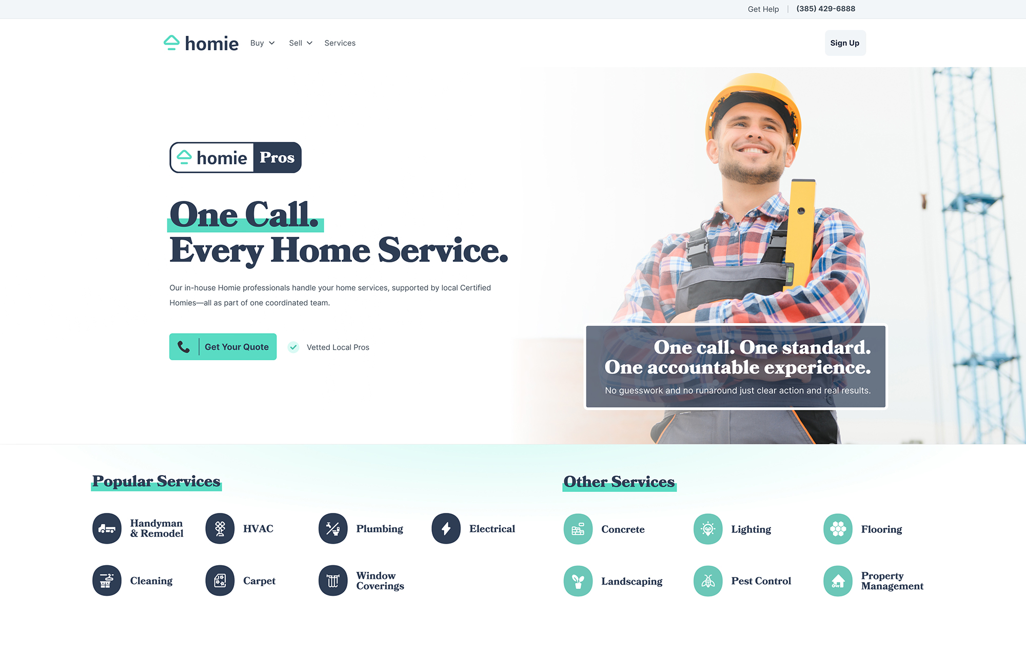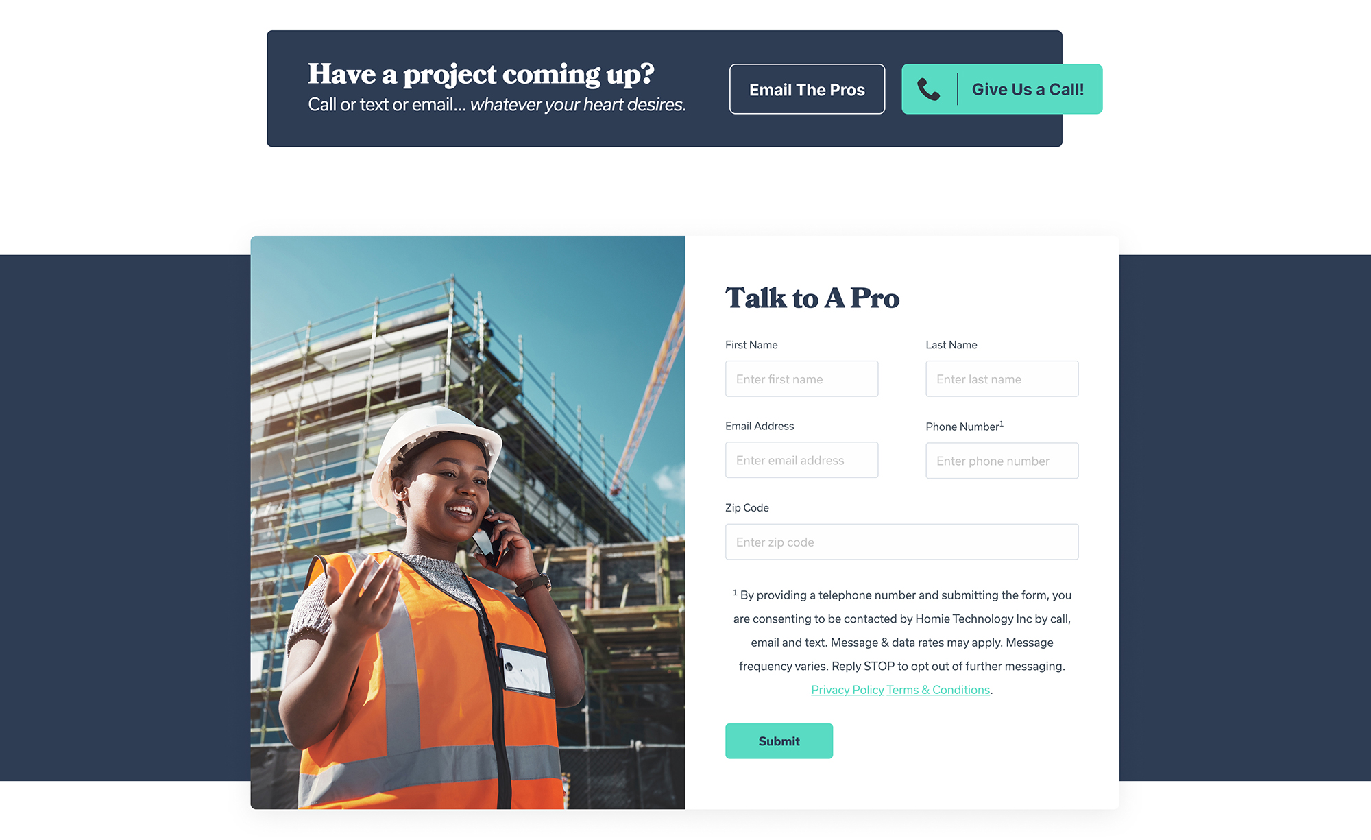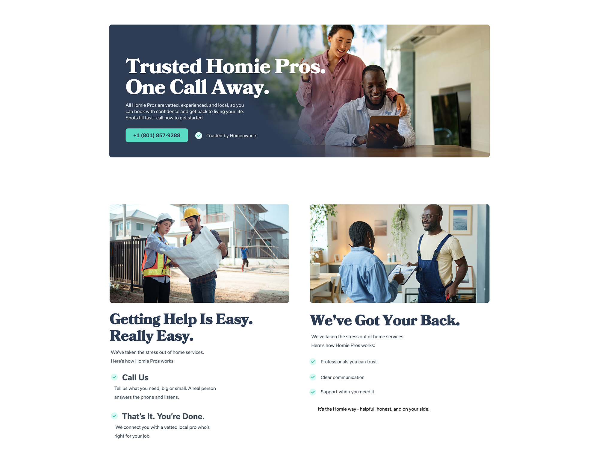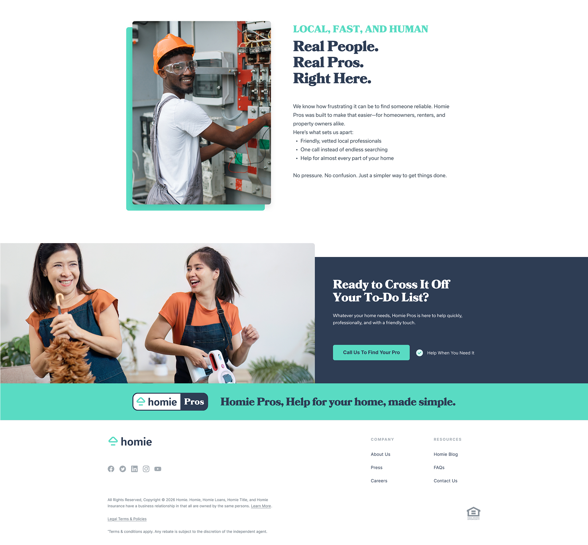 I was brought on to write, design, and code Homie’s new landing page for Homie Pros, a home services section of the Homie brand. After a thirty minute call with the COO, I wrote all web copy and laid out the design in Figma within two days. I focused on clean design, iterative CTAs, and a full list of services for SEO optimization.