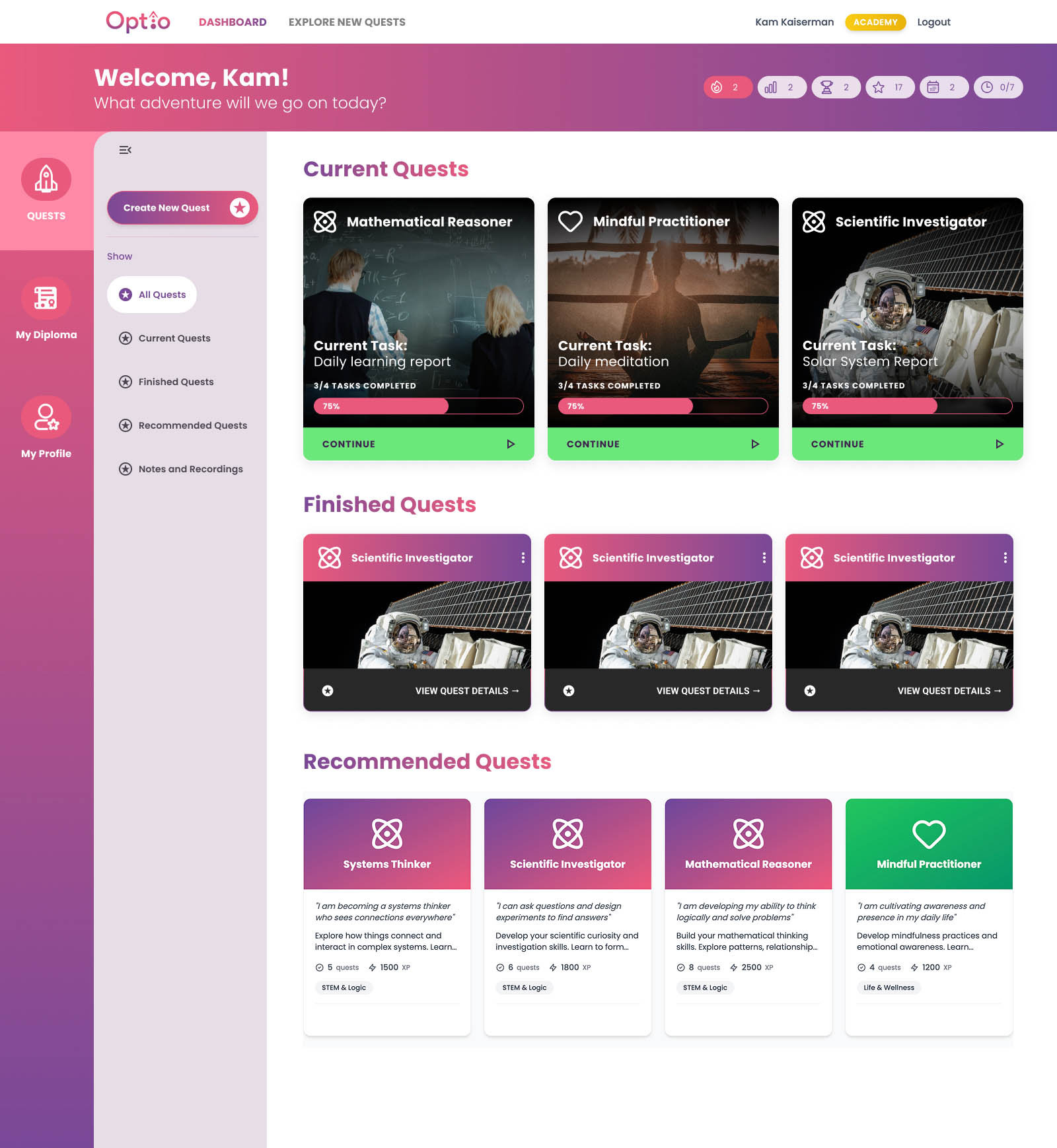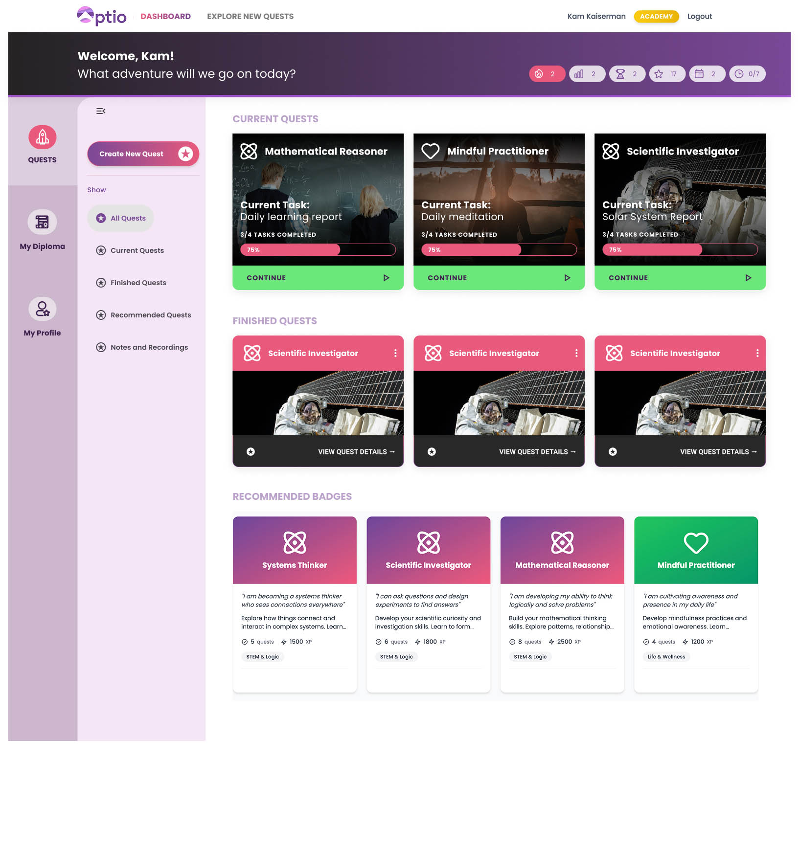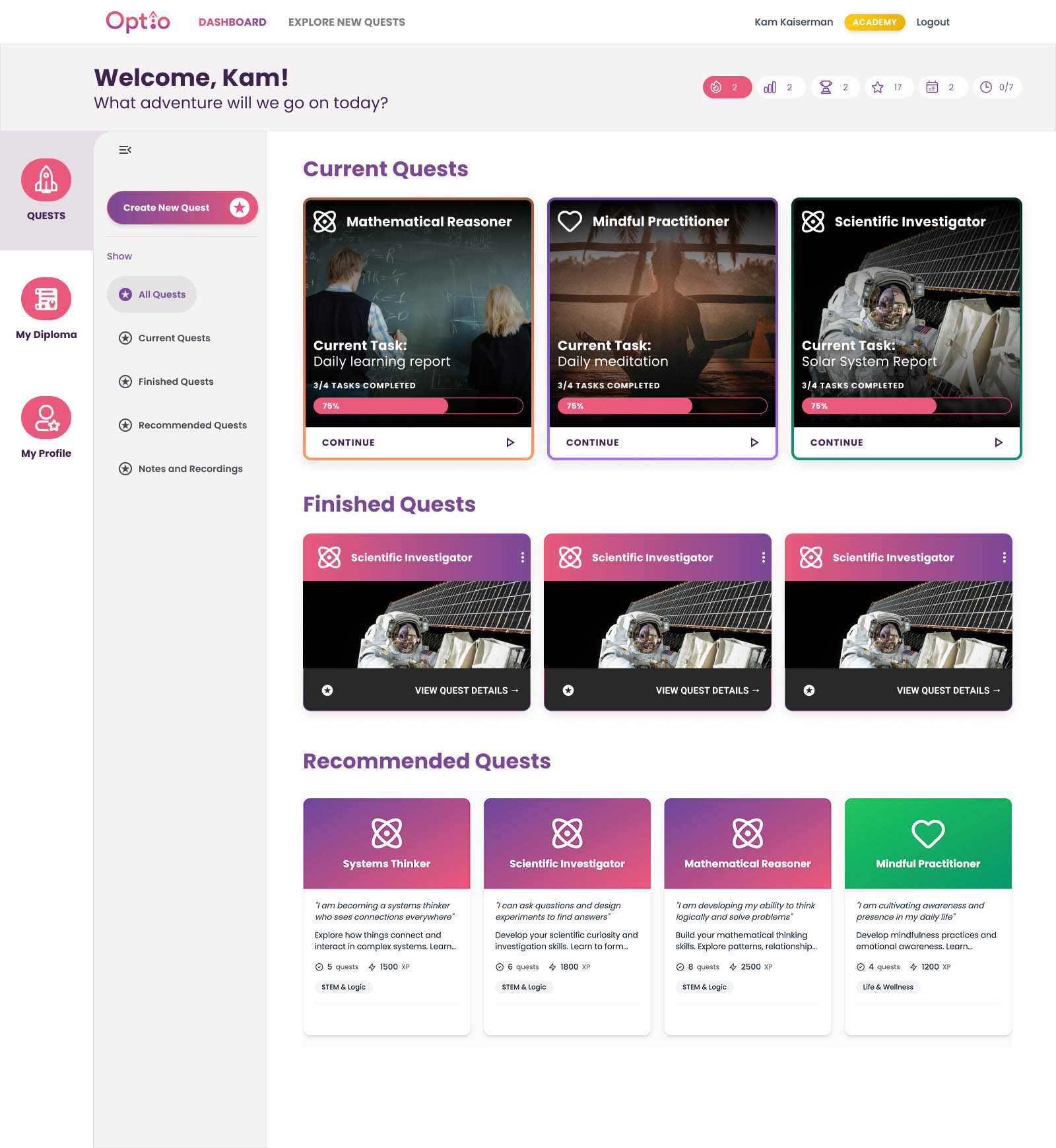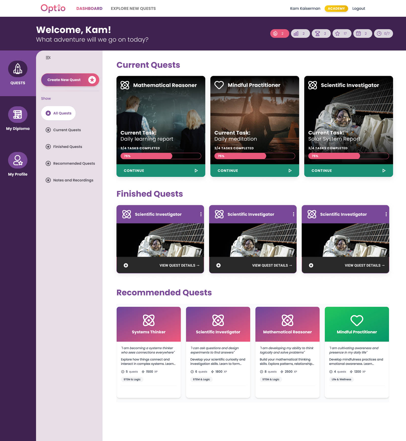 With the introduction of side menus, separating appropriate information into separate pages, and ensuring students would always be shown their tasks and stats upon entering the interface, we were able to create a balanced, engaging product.